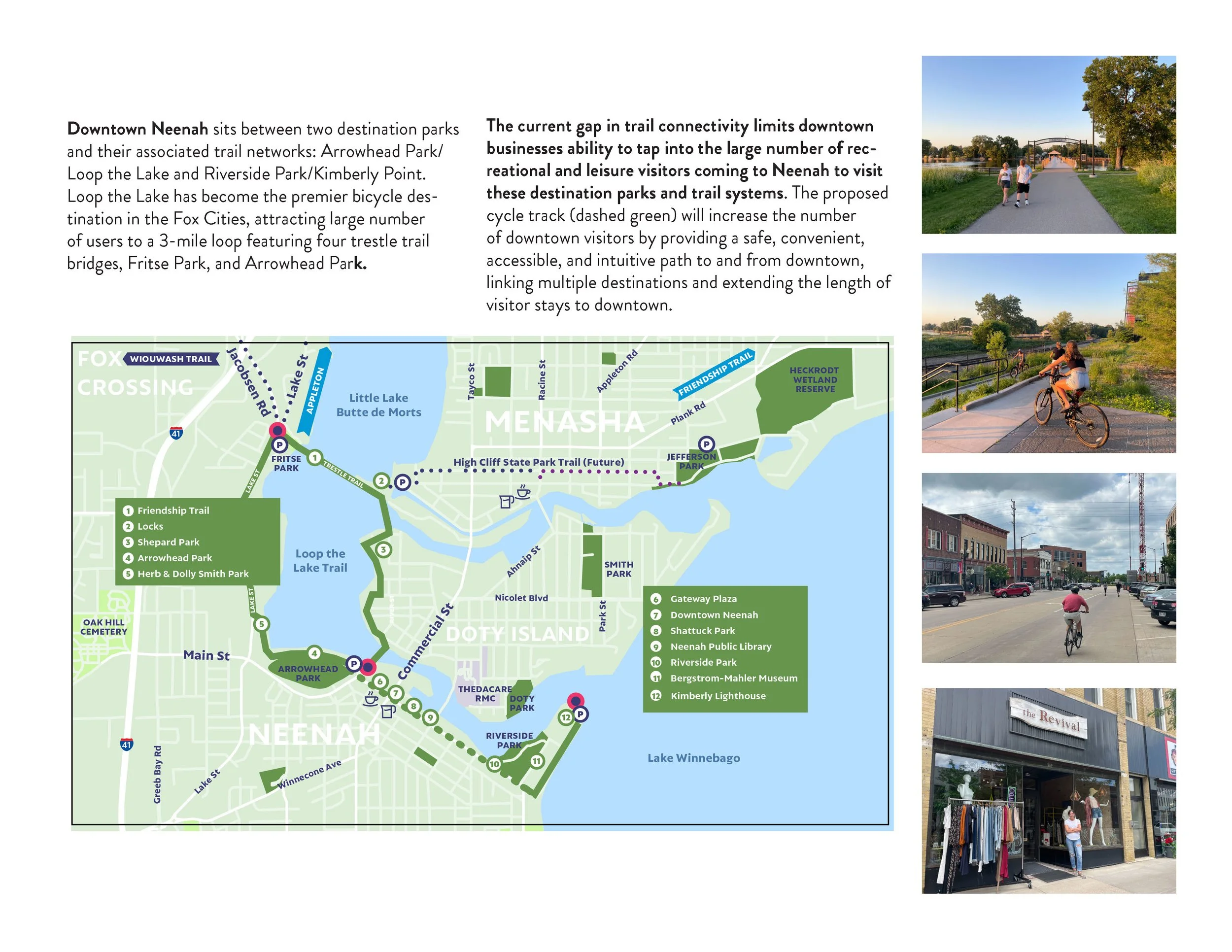 Neighborhood Planners was a sub-consultant to RDG Planning + Design for a study which identified a potential cycle track linking Arrowhead Park on Little Lake Butte Des Morts to Kimberly Point on Lake Winnebago. The proposed bicycle facility would benefit downtown businesses and connect to existing trails, on-street bike lanes and routes.